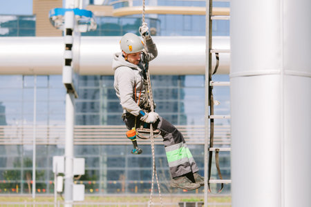 Industrial climber in helmet and overall working on height. Risky job. Professional worker
