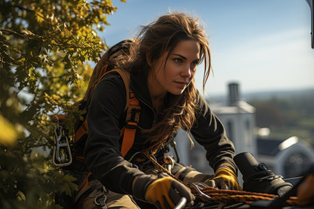 graceful arborist, skillfully ascending a rope to prune and cut for big trees in action expertise in tree maintenance.Generated with AI