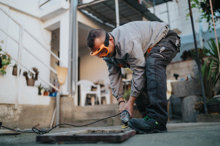 Man working outdoors with a power grinder, wearing safety goggles, cutting metal panel
