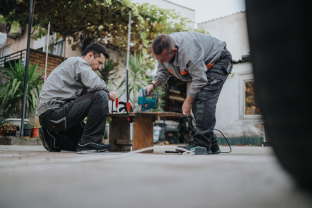 Two workers repair a wooden bench with a power jigsaw on a sunny urban scene