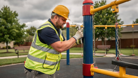 Male worker tightening bolts on a colorful swing set in a suburban playground with blurred trees and benches in the background under cloudy skies.