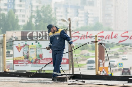 Tyumen, Russia - July 31, 2013: JSC Mostostroy-11. Bridge construction for outcome of Melnikayte street and Shirotnaya streei in Tyumen. Worker holds a gas torch to waterproofing of seams on bridge
