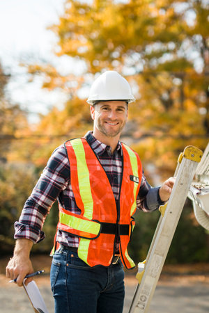 man with hard hat standing on steps inspecting house roof