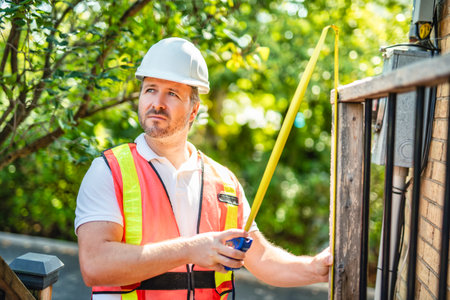 inspector or engineer with ladder checking the building structure and house roof specifications.