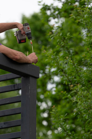 The craftsman screws screws into a wooden beam to connect the wall to the upper beam, moments of assembling a modern wooden gazebo.