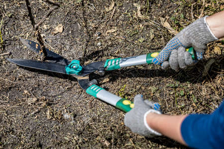 garden shears cut a dry branch in the garden. high quality photo