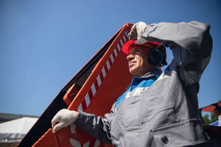 Professional mechanic in hard hat holds on to lifting mechanism of bulldozer bucket for loading coal