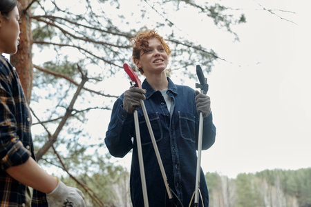 Young adult woman smiling while holding gardening shears outdoors, standing near another young adult woman in wooded area, both wearing gloves and engaging in outdoor work