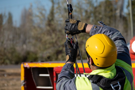 Firefighter, secure rope to lift stretcher.