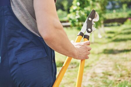 Gardener in the garden with a temporary hut and large shears for pruning bushes.