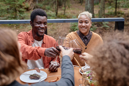 Young black couple and their interracial friends chatting during outdoor dinner by table served with homemade food and drinks