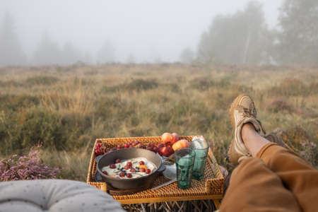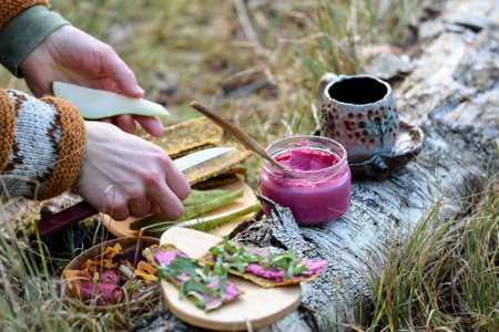 Woman in a knitted sweater is preparing a hot drink and vegan meal in the forest