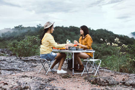 Couple asian friends cooking food for dinner at outdoor together,Enjoying camping concept
