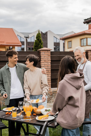 Young brunette woman in white vest looking at her husband putting fresh fruit on table prepared for family dinner on backyard of country house