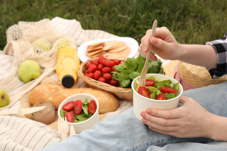 woman hand serving cake on picnic table with food served outdoors on the fabric picnic cloth. Close up, top view. Fresh vegetables and fruits, grapes, orange, raspberry, cheese sticks, cookies and cake for dessert.