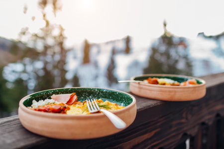 Breakfast for two on hotel balcony enjoying winter Carpathian mountains landscape. Eating tasty food among peaceful nature during trip