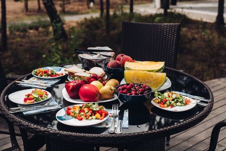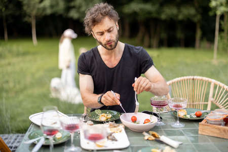 Guy eating healthy food, having a dinner at beautiful table at backyard on nature