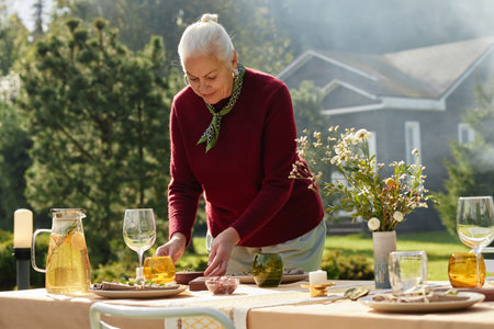 Senior Caucasian woman arranging tableware on outdoor dining table, standing near floral centerpiece and glass pitcher with lemon water, preparing for gathering in garden setting