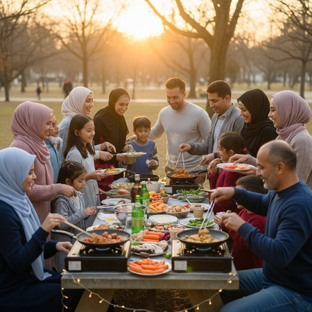 Multiracial friends enjoying a picnic in a natural setting on a cloudy day