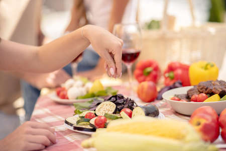 A close-up of young friends putting corn and skewers on grill and having barbecue when camping in campground.