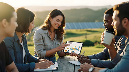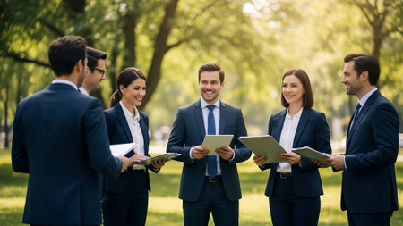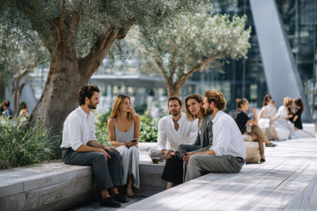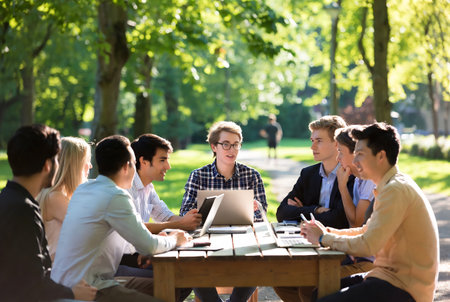 Young professionals gather outdoors for a collaborative study and business meeting on a sunny day