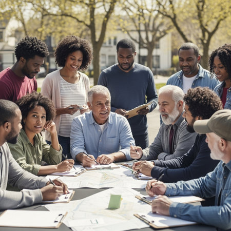 A wide-angle, cinematic photograph showing a diverse team of neighborhood residents meeting outdoors
