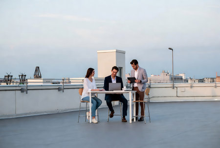 A diverse group of young professionals socializing and working on laptops on a rooftop during sunset in a city setting.