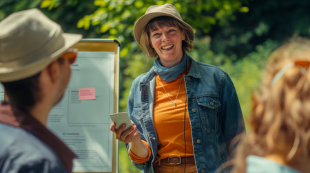 Business professionals read colorful brochures during an outdoor urban presentation and collaborative discussion