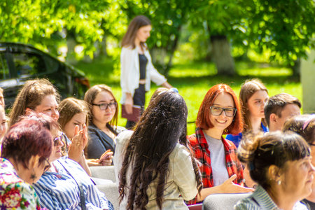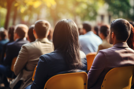 Diverse group backs of young people sitting outdoors man woman students listening speaker watching presentation conference cinema concert. Business education learning study entrepreneurship audience