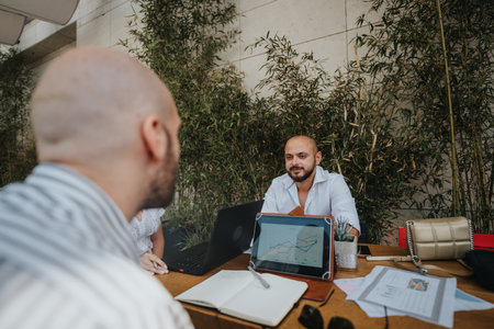 Multiracial business team strategizing at an outdoor coffee bar with laptops and documents during a sunny day