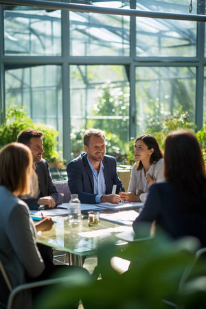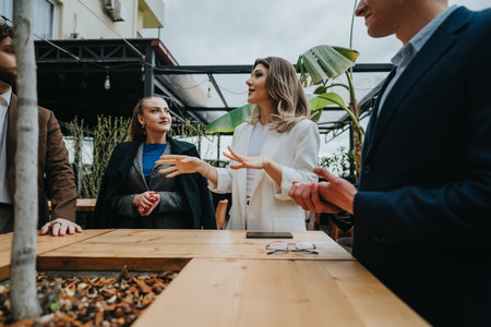 Business coworkers discuss ideas at an outdoor cafe, collaborating with gestures and professional attire