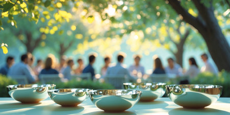 AI Generated. Blurred Social Gathering Under Trees with Shiny Bowls in Foreground