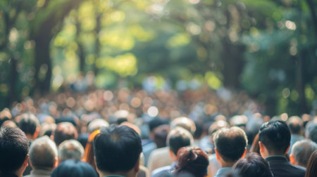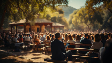A sea of indistinguishable faces sit in front of a blurred backdrop of trees united in their faith at the outdoor church service