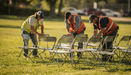 Medium shot of crew unfolding metal folding chairs on a grassy field while the surroundings remain out of focus.