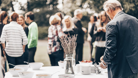 Banquet lunch break at conference meeting on hotel terrace. Assortment of food and beverage. Unrecognizable people discussing over food in background.