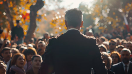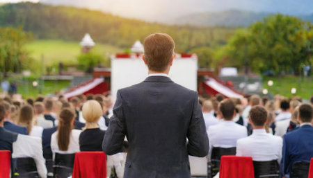 Back view of a professional man in a business suit giving an engaging speech on a stage, addressing an attentive audience during a corporate seminar, conference, or public speaking event in a