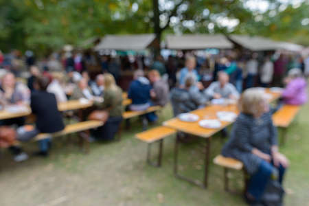 Abstract blur people picnic in public park with family or friends, urban leisure lifestyle. Streed food fest.