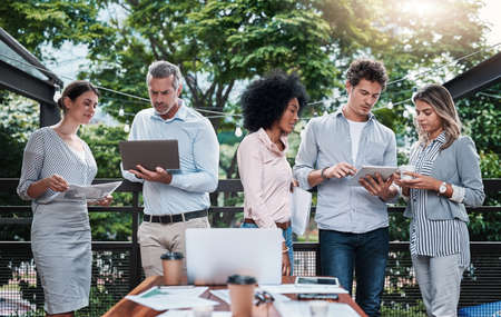 Getting things done is what they do. a group of businesspeople working together outdoors.