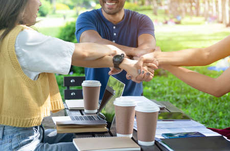 group of friend hands together for successful of their work, happy young asian people casual working in the park.there are laptop,tablet,smartphone,books, paper sheet and coffee cups put on table