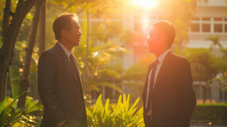 White collar workers engage in collaborative discussion in a city park during sunny afternoon while seated on benches surrounded by greenery