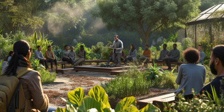 Skilled teacher talking and teaching about environmental sustainable while preparing for planting tree and surrounded with diverse children learning about green clean power. Climate change. AIG42.