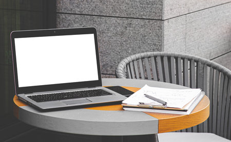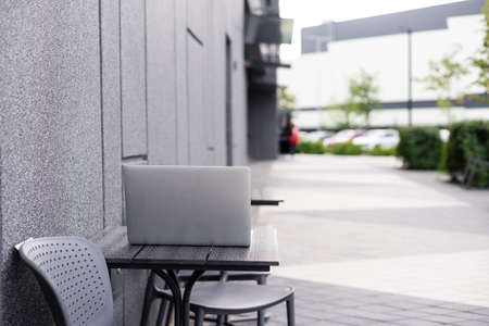 Distance work in a cafe on table with laptop. Free space computer screen mockup