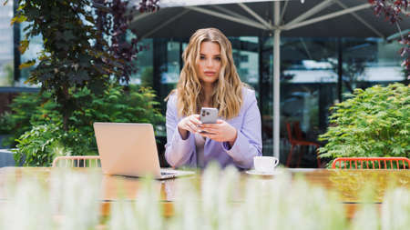 A young woman in a stylish suit is typing a message on her phone while sitting in front of a laptop. Work on the summer terrace