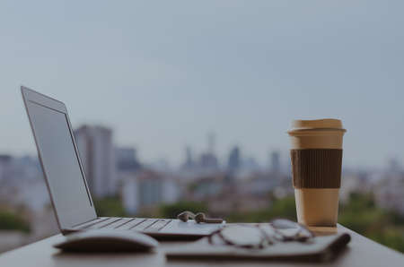 Coffee tumbler puts on working table with laptop and wireless earphone in the morning with city view background.