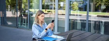 Portrait of businesswoman sitting outdoors and working. Young corporate woman looking at her smartphone, sitting outside with laptop and digital tablet