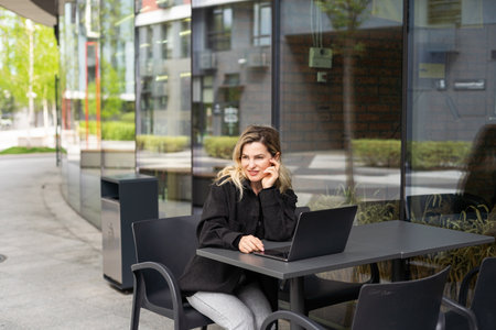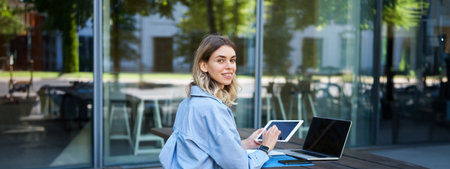 Portrait of successful businesswoman works outside on fresh air, sits near laptop, holds digital tablet and looks at camera