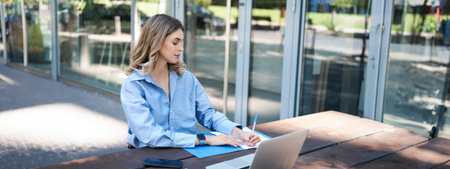 Portrait of beautiful young woman working on fresh air outside. Corporate woman writing in her documents and folders, using laptop outdoors