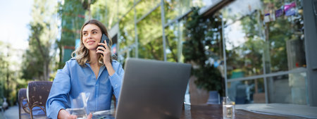 Portrait of young businesswoman sitting outside in park, talking on mobile phone, using laptop. Young woman, student working outdoors, calling, talking on telephone