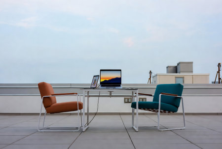 Home office concept. Designated work from home area at the balcony. Modern laptop, notebook and a cup of coffee on table, stylish straw chair with cushions. Close up, AI Generative
