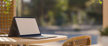Portable laptop white screen mockup on a wood table in the minimal comfortable coffee shop seating area near the window. closeup image. 3d rendering, 3d illustration
